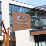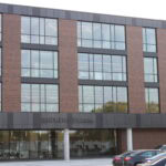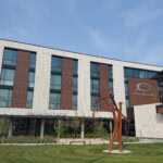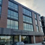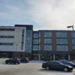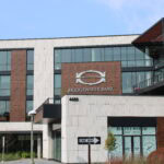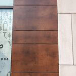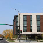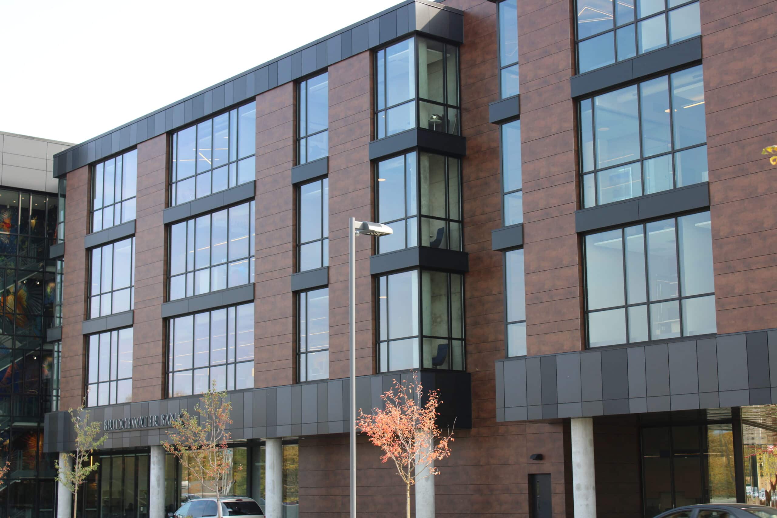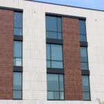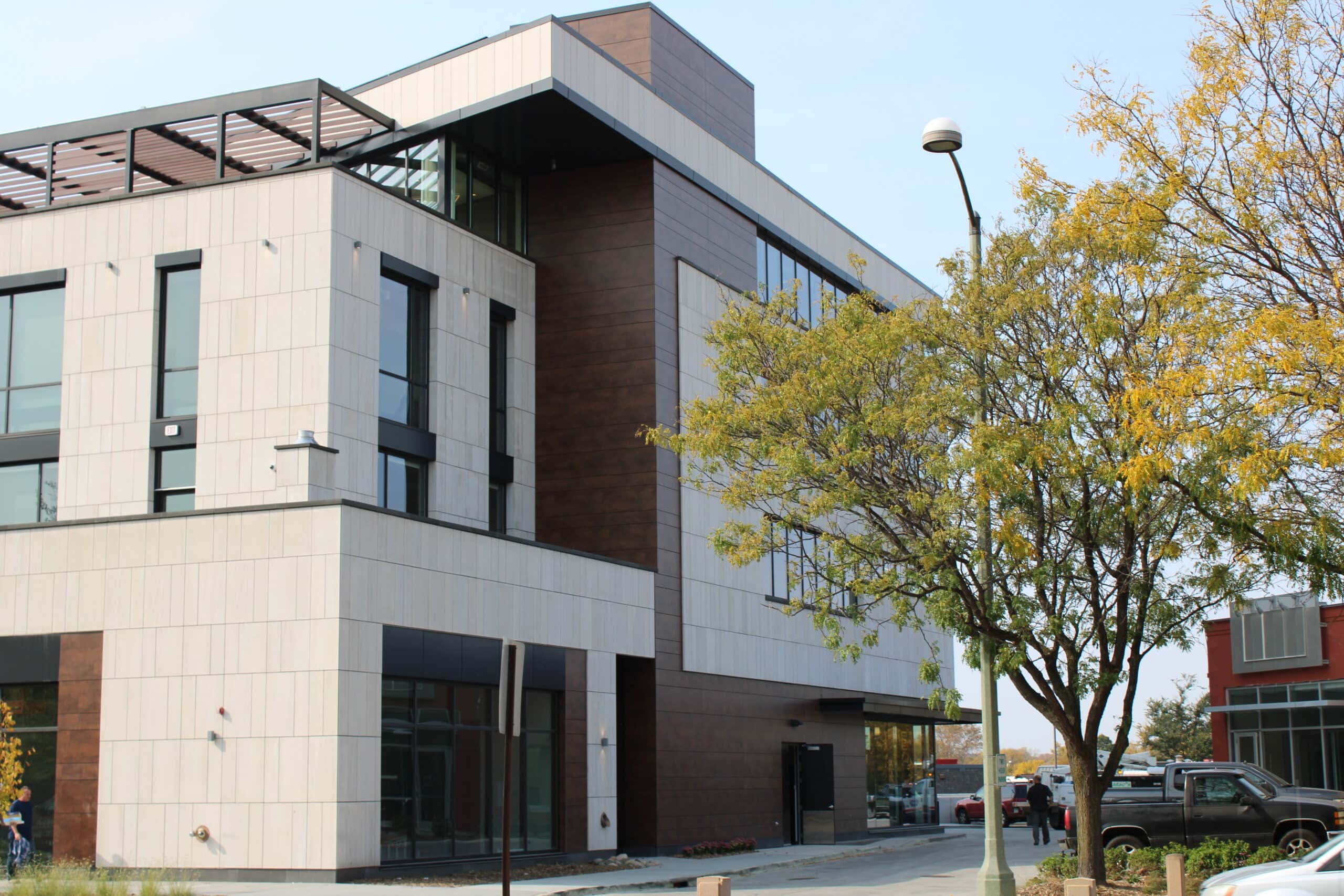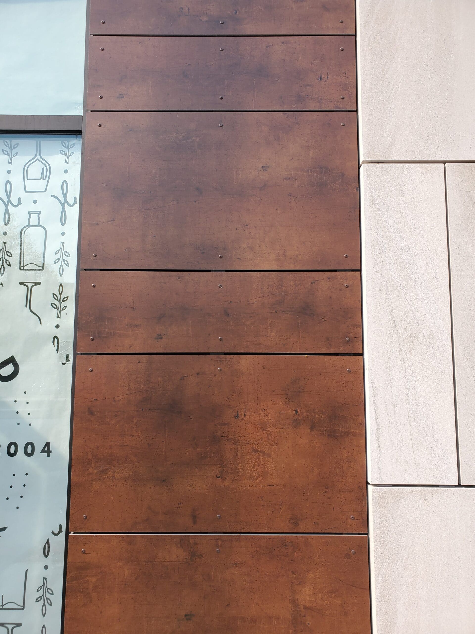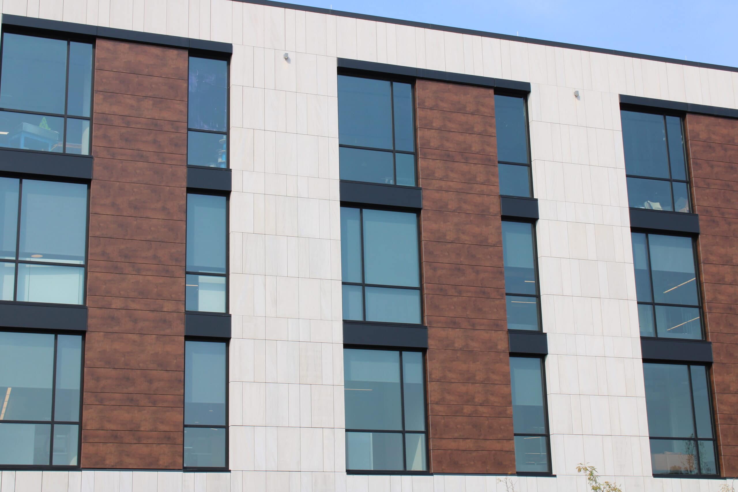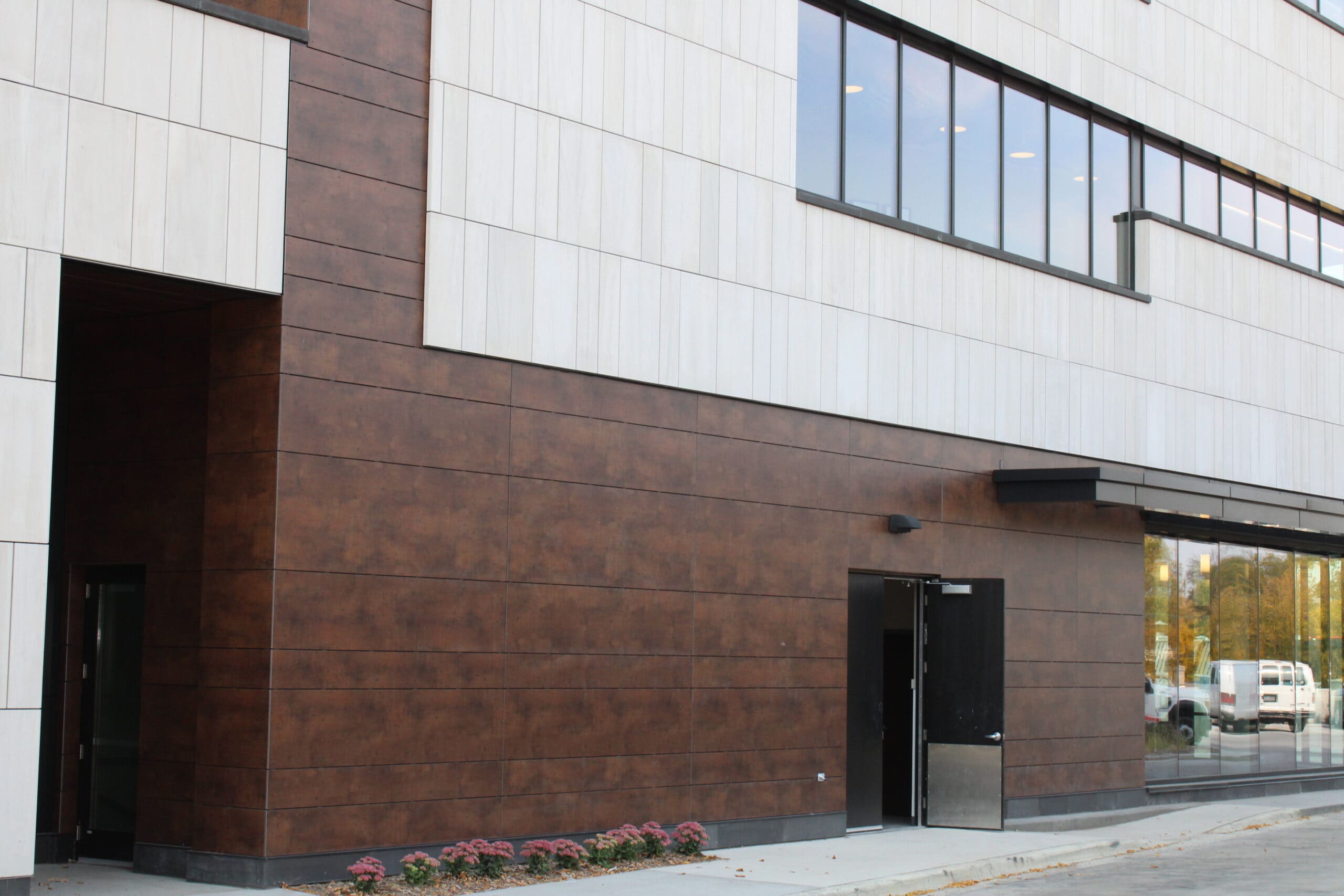 Portions throughout the exterior are clad with Fundermax Max Compact Exterior panels in a material decor, adding accents of bronze throughout the facade and drawing attention to the building’s branding signage.