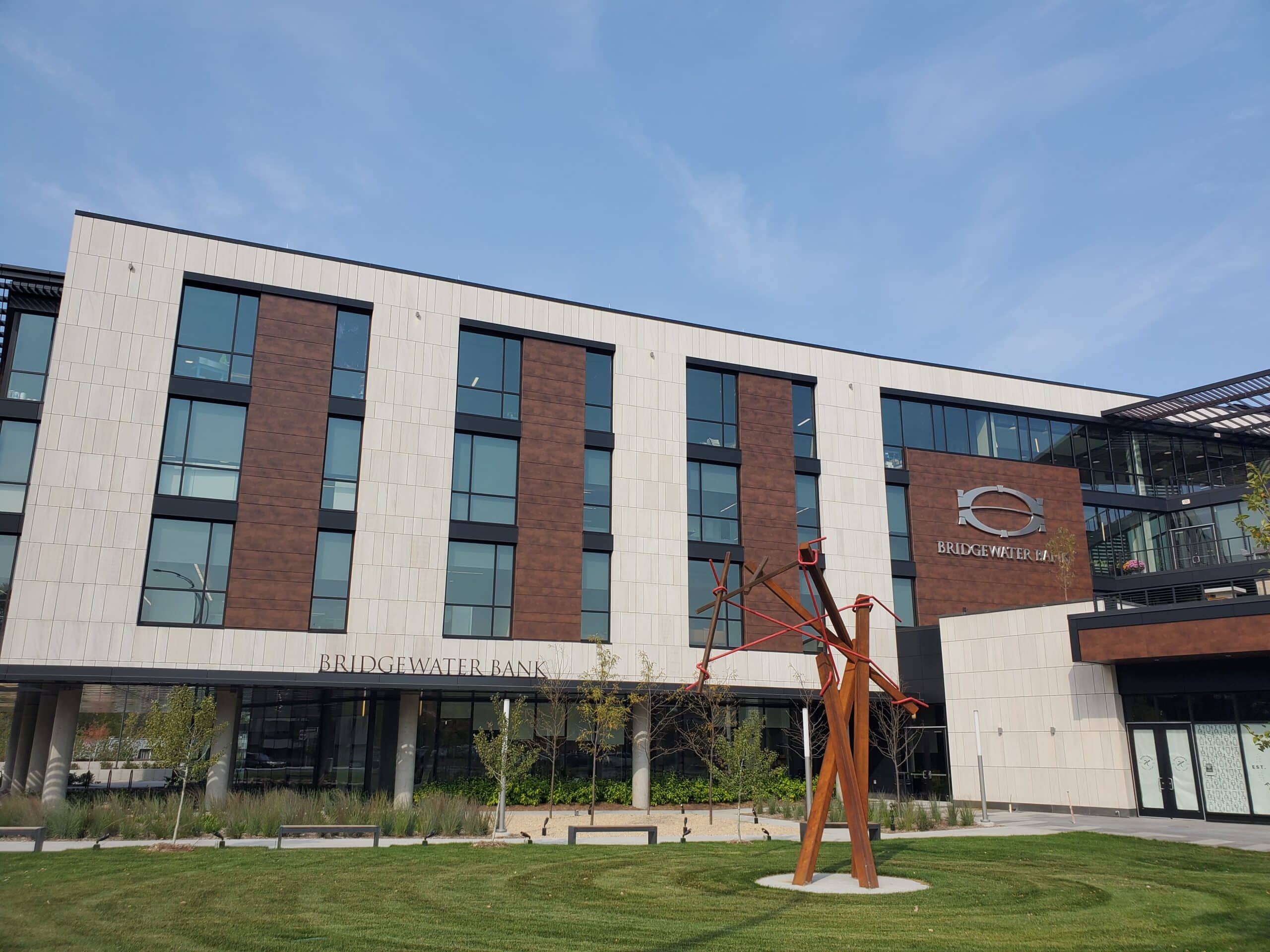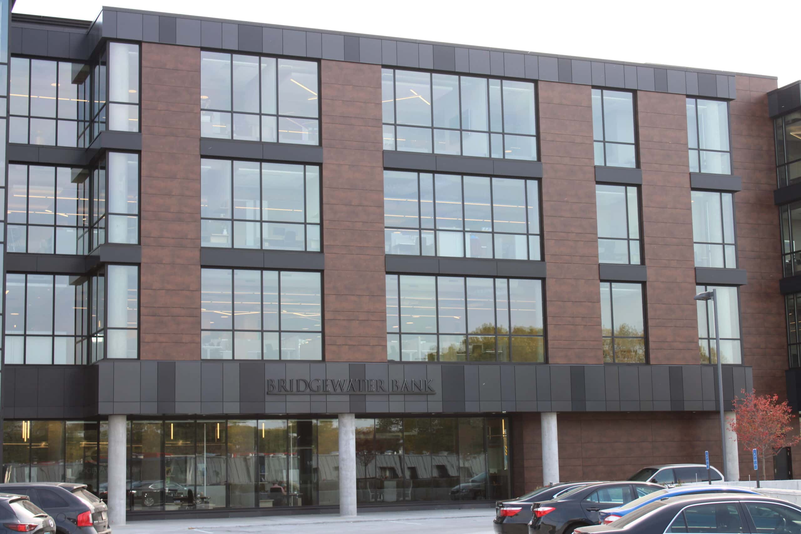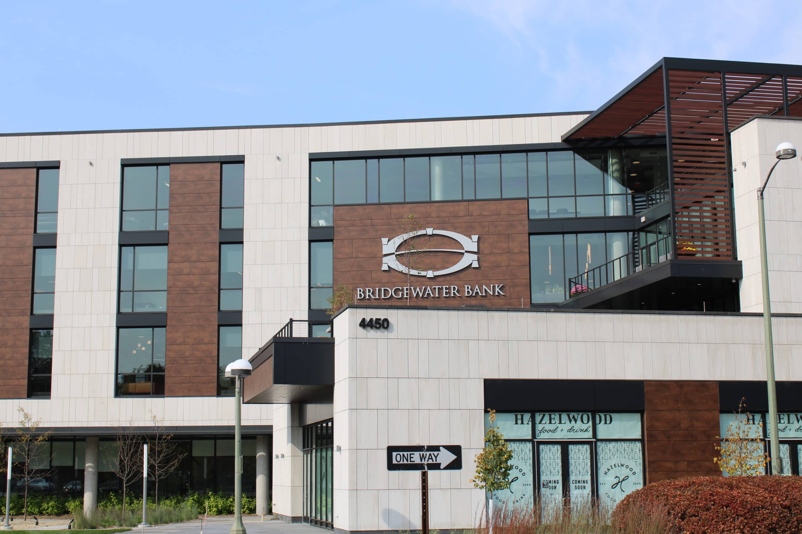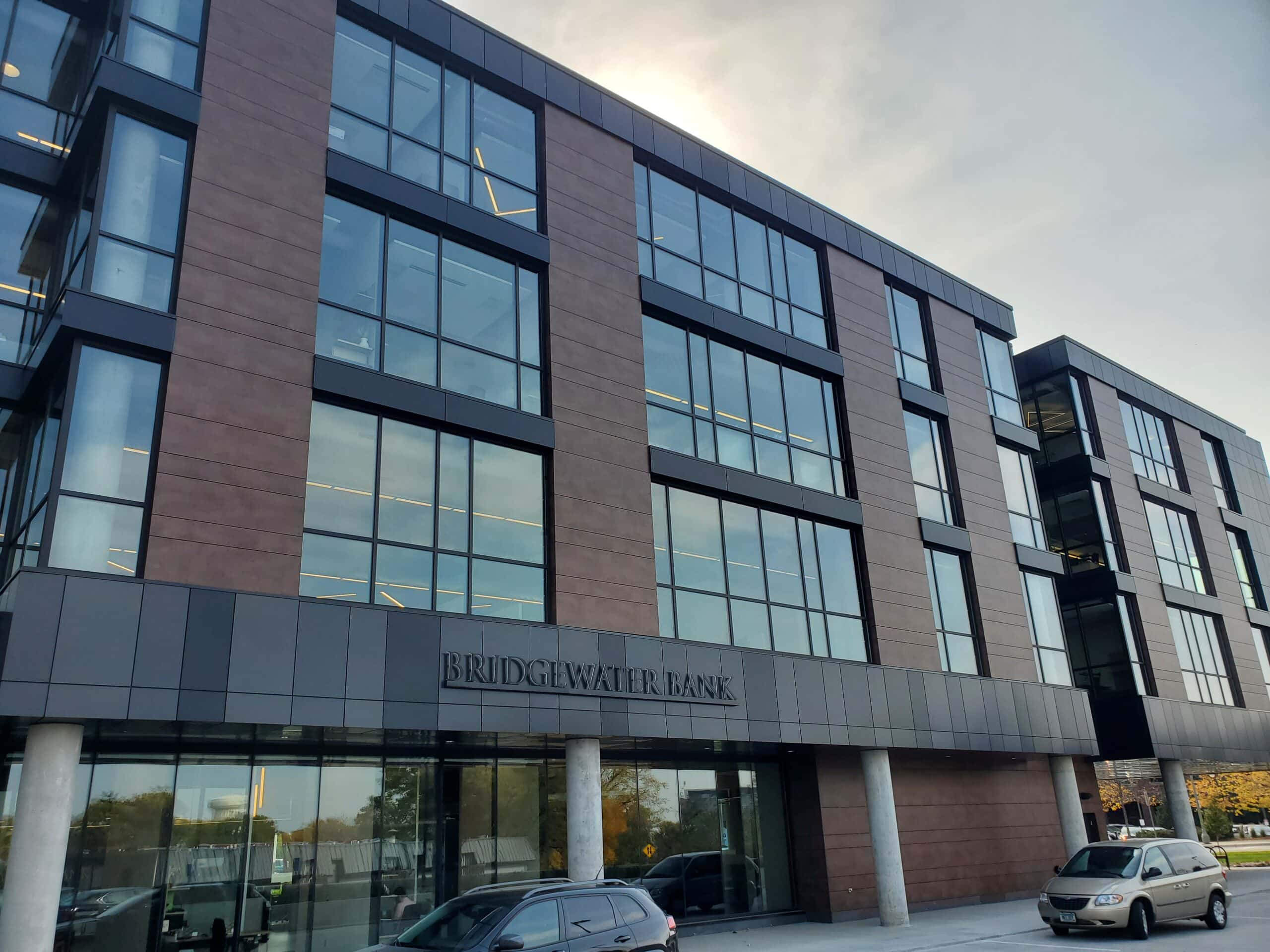 The Bridgewater Bank building in St Louis Park, Minnesota, is a four-story, 84,000 square foot mixed-use renovated office building serving as the bank’s headquarters and an entrepreneurial hub to provide job diversity to the area’s residents.