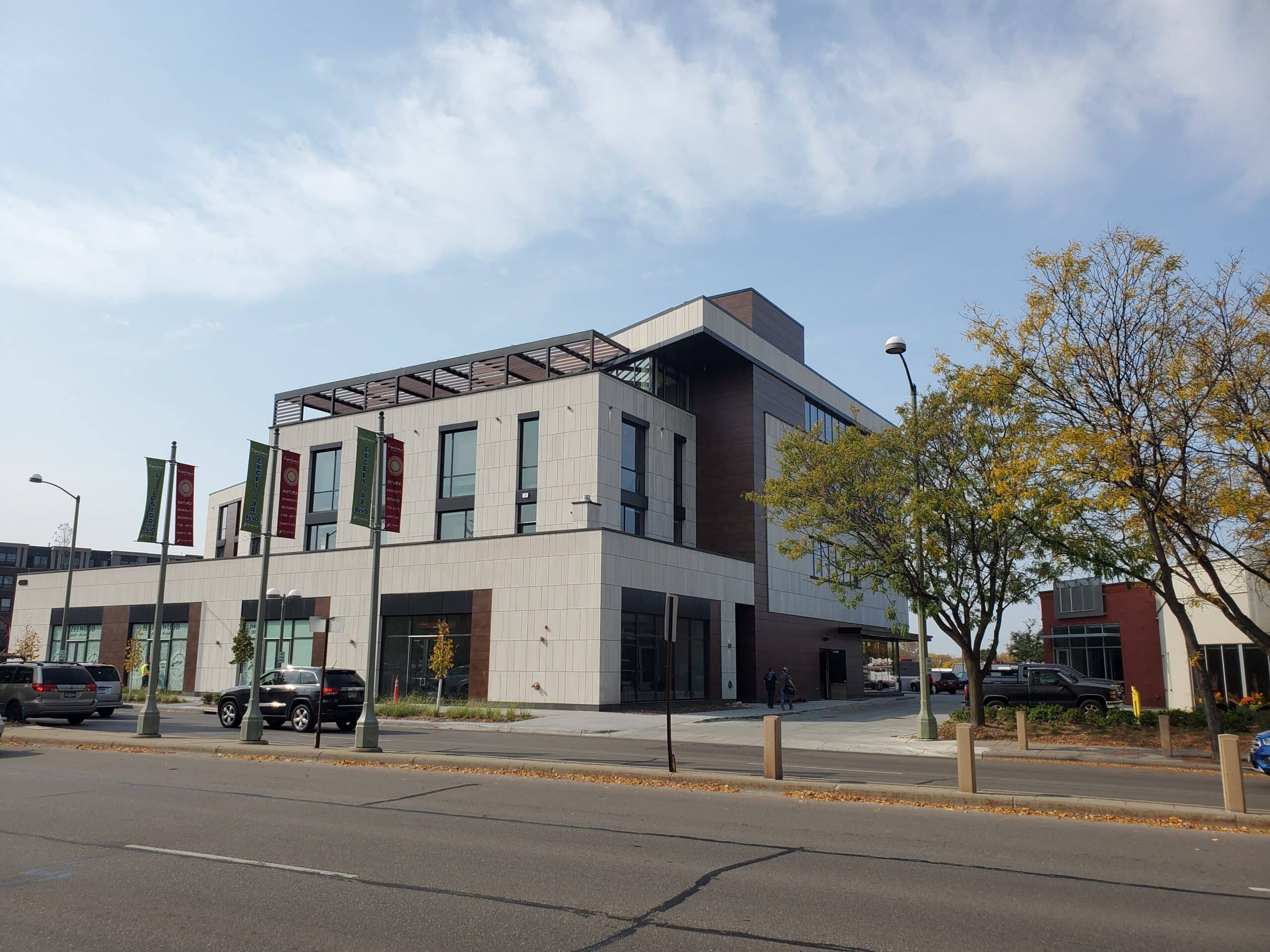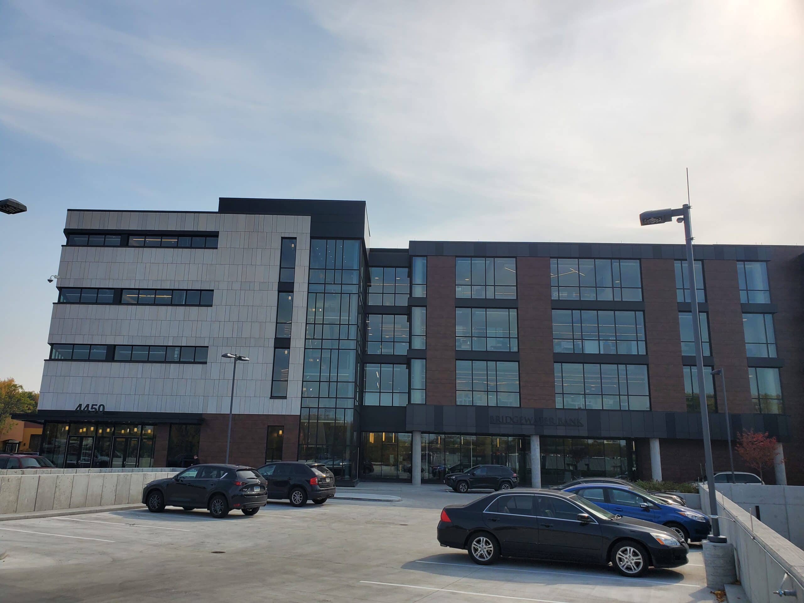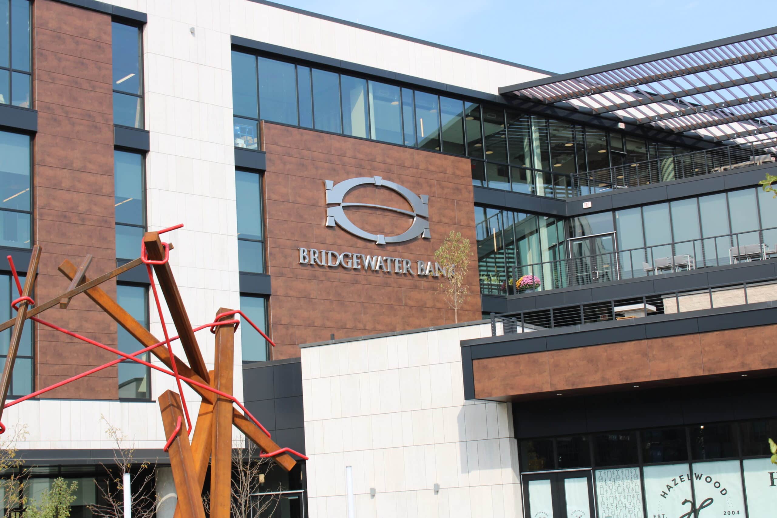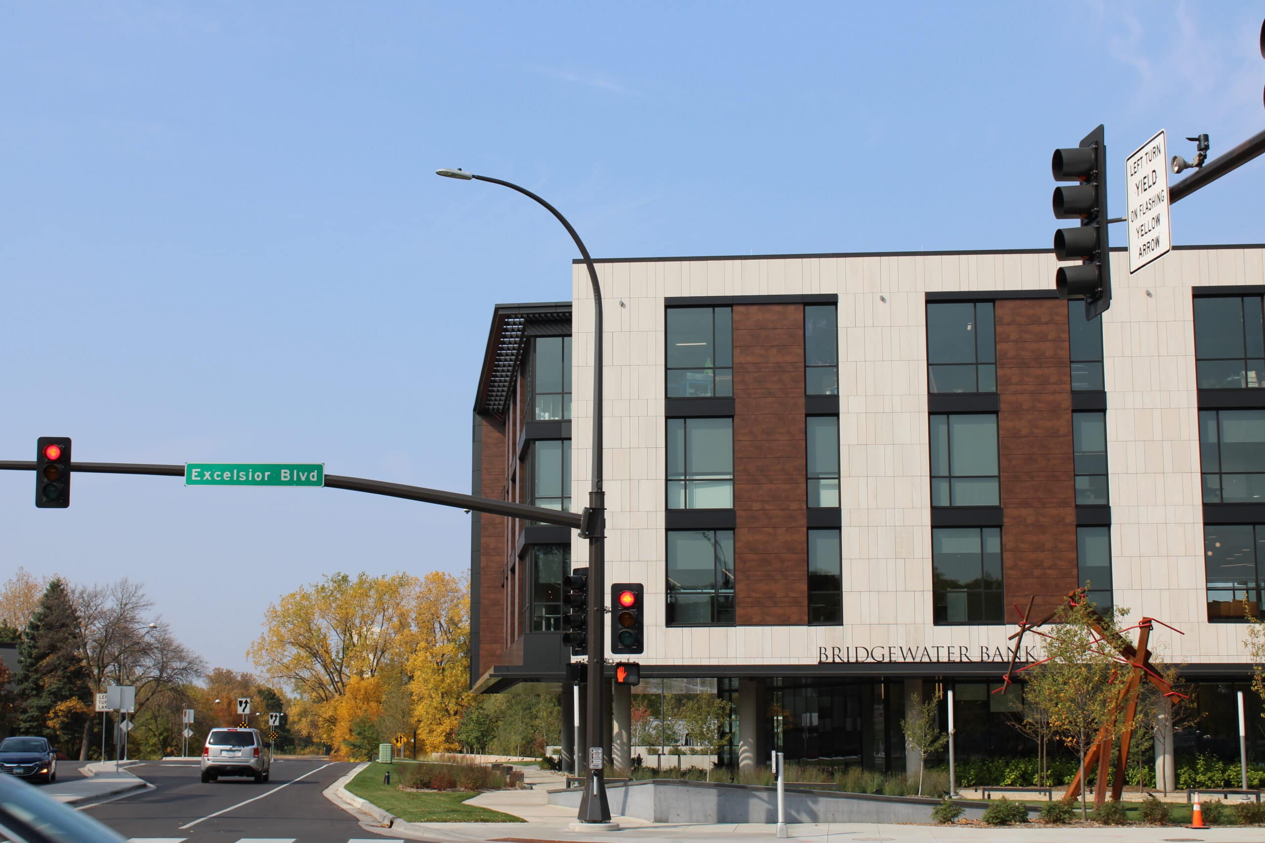 The Bridgewater Bank building in St Louis Park, Minnesota, is a four-story, 84,000 square foot mixed-use renovated office building serving as the bank’s headquarters and an entrepreneurial hub to provide job diversity to the area’s residents.